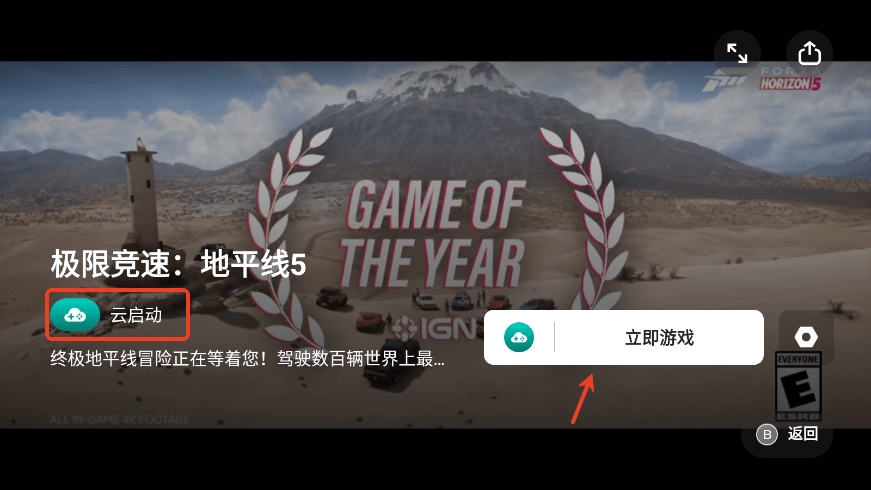 7、在首页,选择支持云启动的游戏,如极限竞速:地平线5,点击"立即游戏";