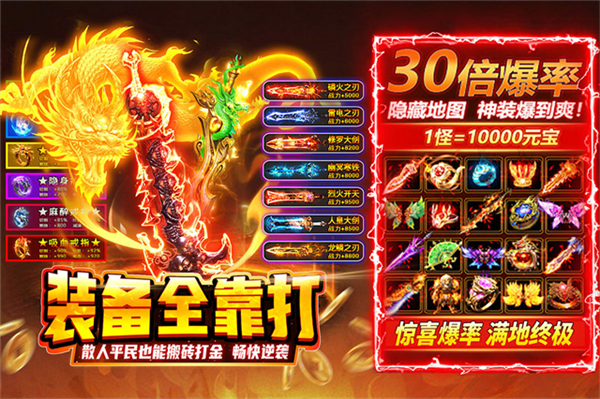 2、超高爆率掉落,极品神装、神级装备、梦幻坐骑等怒爆神装,随机掉落。